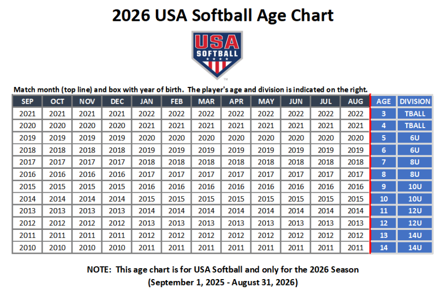 South Middleton Youth Softball League will follow USA Softball’s age qualifications, which are listed on the chart below and goes into effect annually beginning September 1st, and apply to both the Fall and Spring seasons.